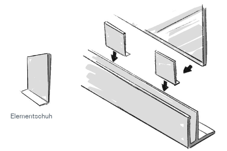 6. Einsetzen der Elementschuhe im Alublock. Diese gleichmäßig auf der entsprechenden Länge verteilen. Danach das Glaselement vorsichtig in den Alublock (auf die “Schuhe”) einsetzen und halten.