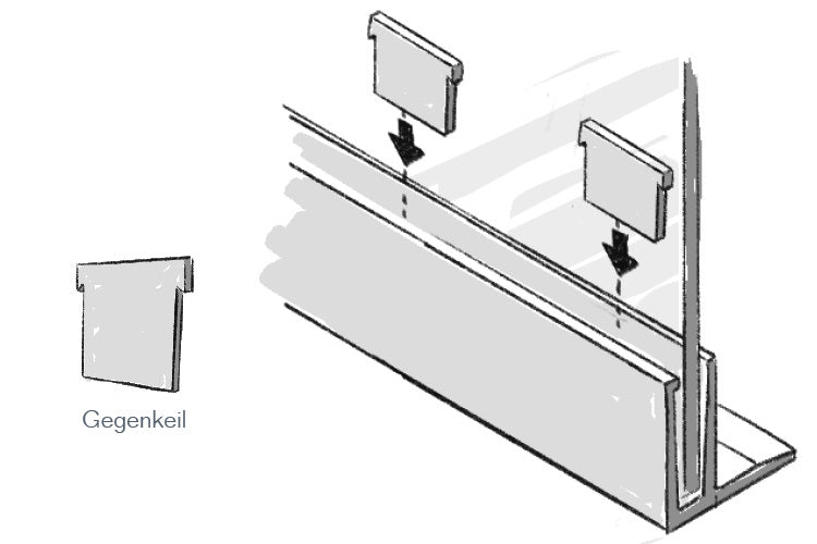 7. Gegenkeile an gegenüberliegender Seite mit der glatten Seite zum Glas einfallen lassen. Diese dann dem KNUMOX Einschlagwerkzeug fest eindrücken, so dass das Glaselement einen festen Sitz hat, mindestens so tief, dass später der Gummi darüber passt.