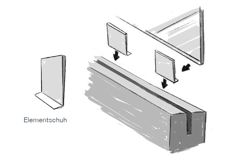 1. Einsetzen der Elementschuhe in das Natursteinfundament. Diese gleichmäßig auf der entsprechenden Länge verteilen. Danach das Glaselement vorsichtig in das Natursteinfundament einsetzen und halten.