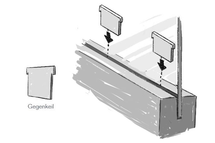 2. Gegenkeile an gegenüberliegender Seite mit der glatten Seite zum Glas einfallen lassen. Diese dann mit dem KNUMOX Einschlagwerkzeug fest eindrücken, so dass das Glaselement einen festen Sitz hat, mindestens so tief, dass später der Gummi darüber passt.