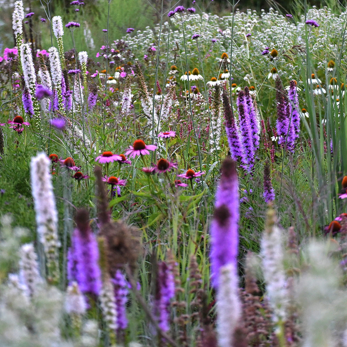 Diese Kombination aus Farbtönen des blau-violetten Spektrums und der Farbe Weiß ist für sonnige, auch eher trockene Standorte gedacht. Neben der Blüte in den Sommermonaten zaubert diese Kombination mit ihren interessanten Strukturen auch über die Wintermonate einzigartige Bilder in den Garten.