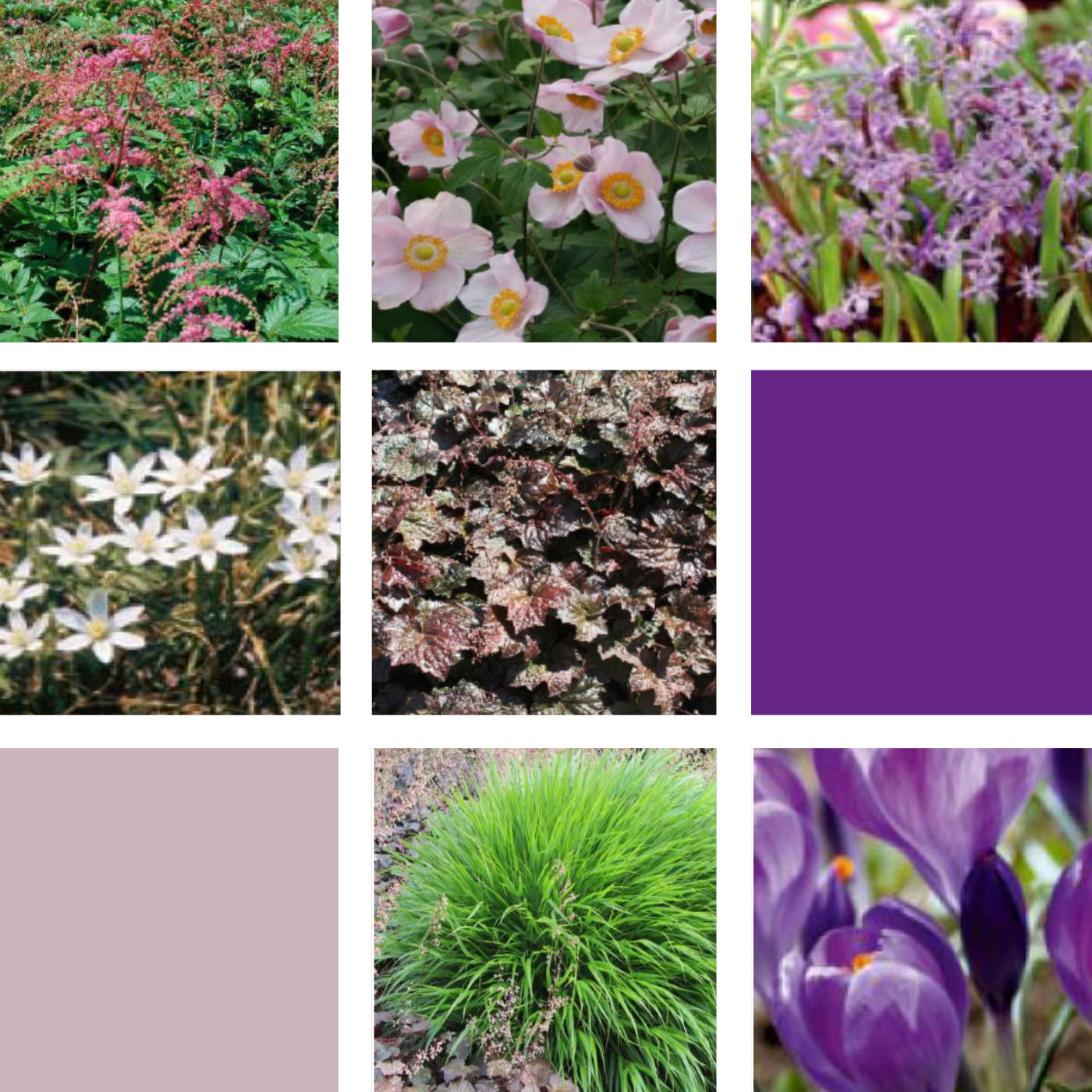 Die zarten Weiß-Lilatöne dieser Kombination bringen Eleganz und Leichtigkeit in schattige und halbschattige Gartenbereiche – und dies nicht nur über die Sommermonate. Auch im Winter punktet dieses Modul mit wintergrünen Aspekten. Die Pflanzung ist für jeden humosen Gartenboden geeignet und toleriert kurzzeitig Trockenheit.